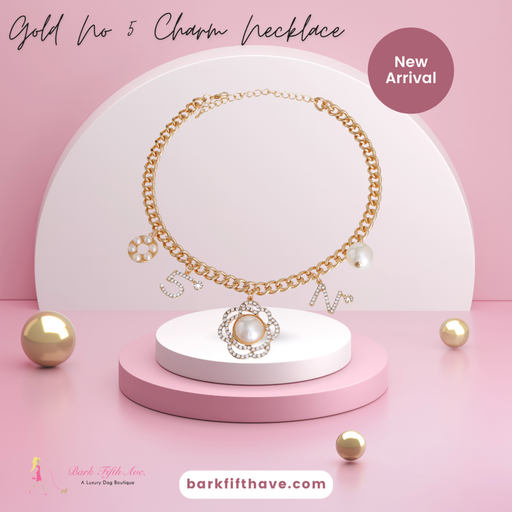 TD-PetsGold Metal Chain Necklace Featuring Rhinestone and Pearl Designer Inspired Charms Including No, 5, and Flower. Center Flower Pendant Charm measures...