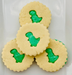 Cute Oreo cookies with a dinosaur cut out on the top, filled with green vanilla icing.